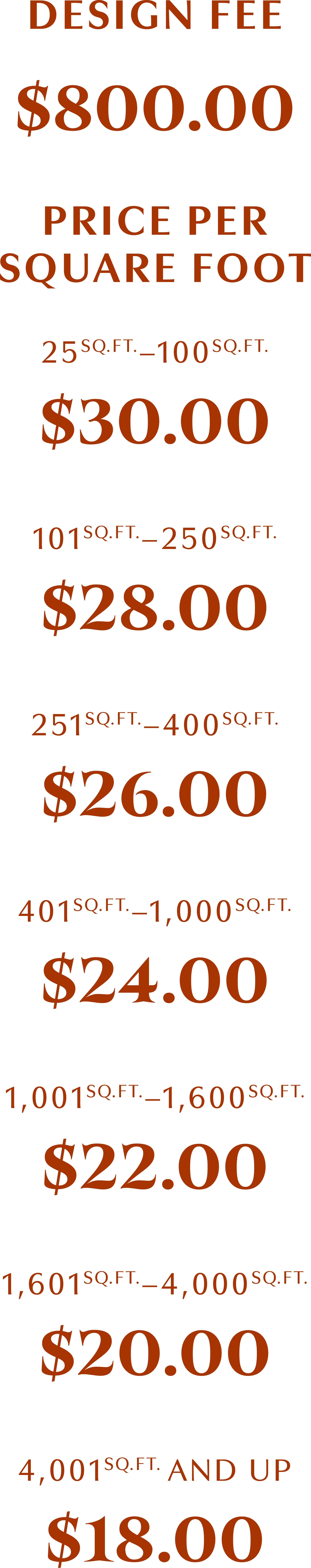 The total price is calculated by adding the design fee to the product of the artwork’s total square footage and the applicable price per square foot.